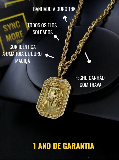 Modelo: Corrente Cadeado 70cm 5mm Fecho Canhão + Pingente Cravejado Placa com Face de Cristo 4D